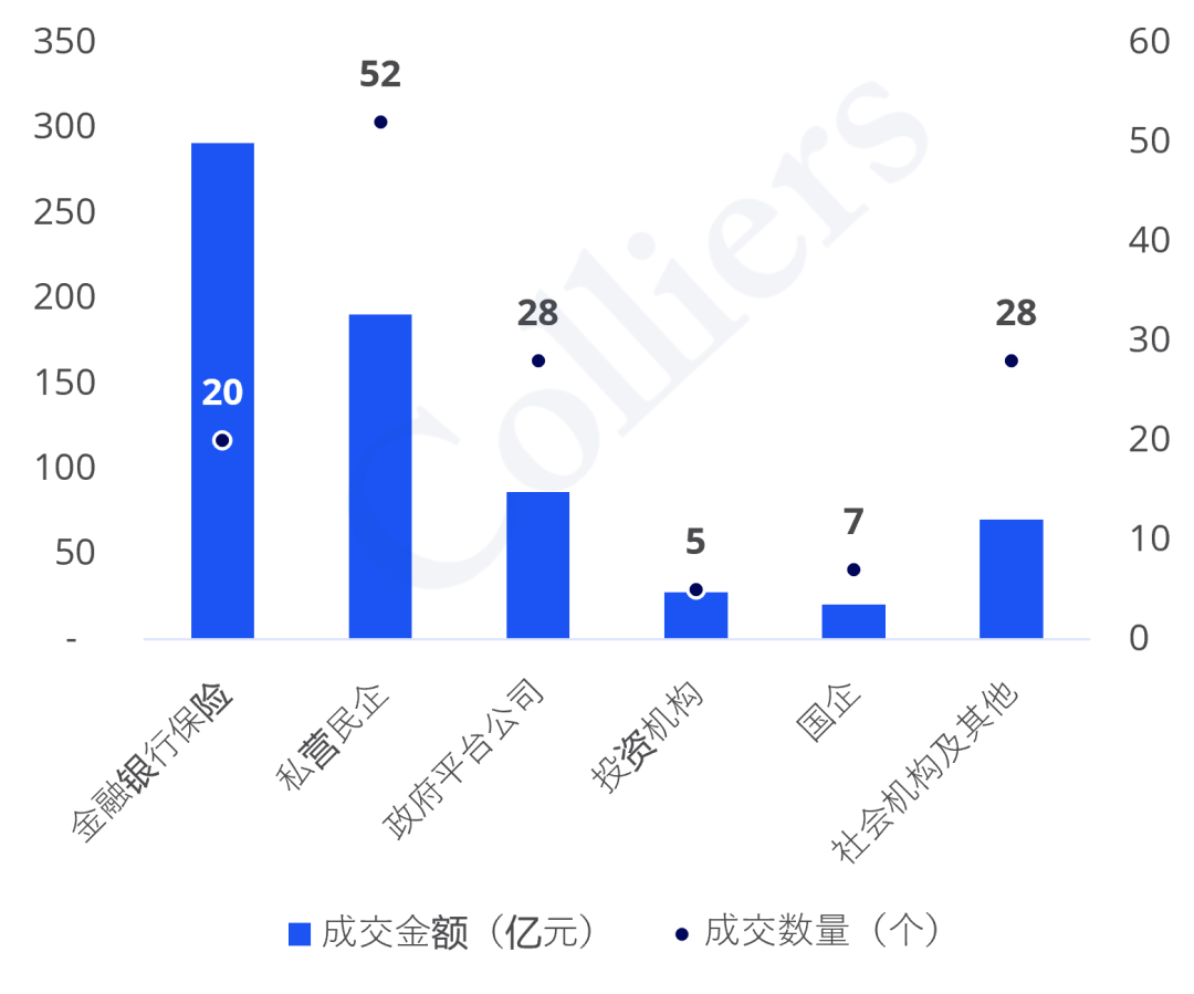从成交数量分析,私营民企的投资金额虽然不及传统金融业,但是数量高于,侧面表现出民营企业对房地产资产配置的需求;政府平台公司列次席,参与主要交易有苏州昆山周庄镇政府平台收购万创中心,苏州工业园区国有资本投资收购丰隆汇综合体项目。