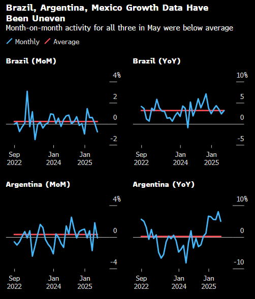 阿根廷将于周三发布 6 月 GDP 替代数据,此前 5 月环比下降 0.1%,表现令人失望。接受央行调查的经济学家预测 2025 年经济增长 5%。