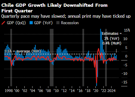 智利本周将率先发布第二季度产出报告、央行交易员调查以及季度经常账户数据。