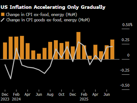 过去一周的数据可能并未改变人们对通胀和经济的看法。剔除食品和能源的核心消费者价格指数 7 月涨幅达到今年年初以来的最高水平,但受关税影响商品的价格涨幅并未如担忧那般剧烈。