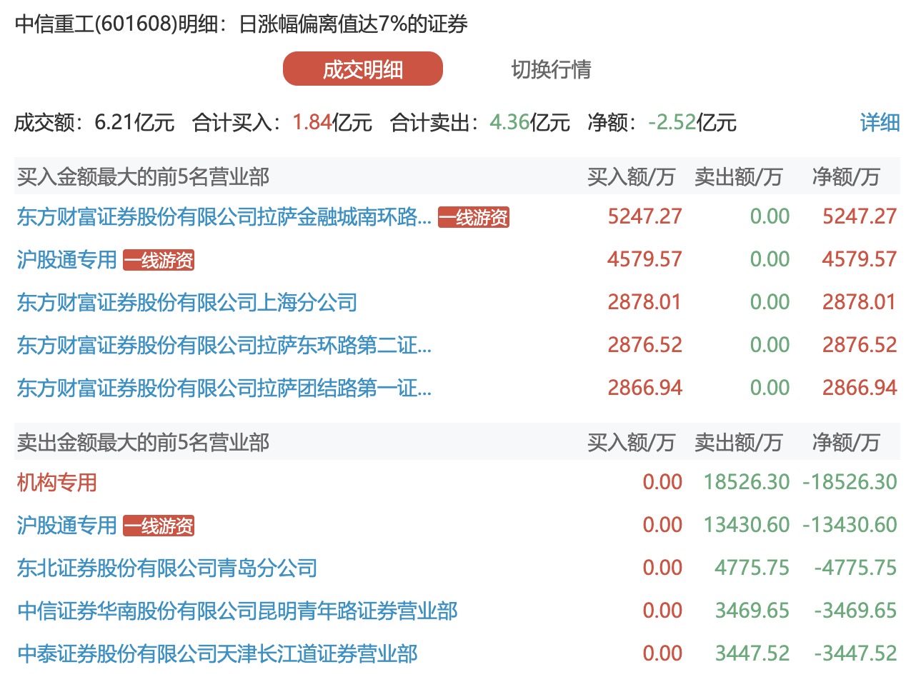 中信重工今日涨停 一机构专用席位净卖出1.85亿元鼎冠策略资中信重工今日涨停 一机构专用席位净卖出1.85亿元