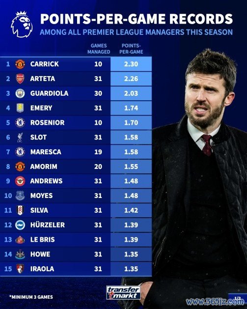 直播吧3月25日讯德国转会市场统计了本赛季英超主帅的场均积分(至少执教3场),并列出榜单,卡里克2.3分居首,阿尔特塔2.26分次席。