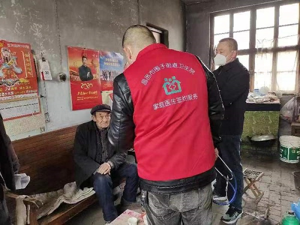 围子街道卫生院的家庭医生为重点人群上门送诊服务
