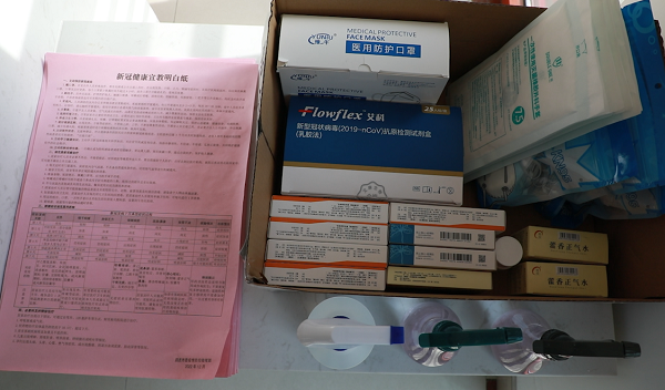 在药品最紧缺的几天,围子村两委与诊所、药店加强联系,做好药品调配,并在村民之间倡导药品共享和拆借,鼓励家中药品有余量的暂时借给急需的村民,保证每个村民都能有药可用。在围子村所属的滨河社区,记者见到了附近几个村子合建的共享药箱,由家中药品、防护用品有余量的村民自愿捐赠,有需要的村民登记后按需领取。